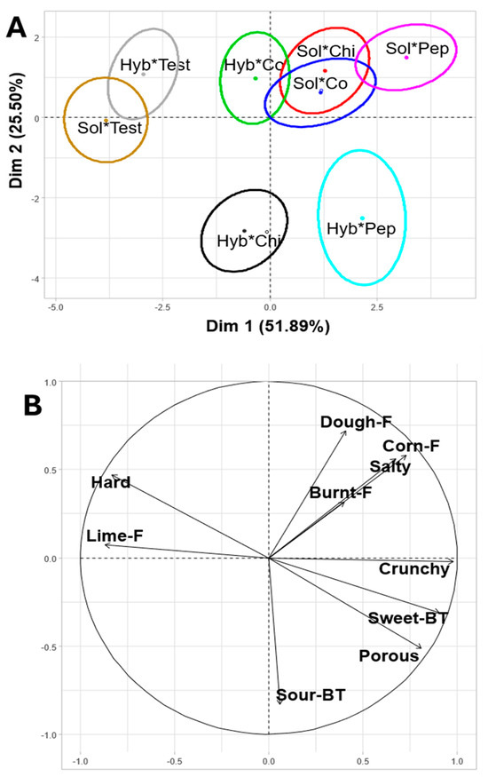 (A) 95% confidence ellipses with 500 resamples and (B) Sensory profile of tostadas made with corn of different races and dehydration methods. Hyb*Co = Hybrid dehydrated Cónico corn tostada; Hyb*Chi = Hybrid dehydrated Chiquito corn tostada; Hyb*Pep = Hybrid dehydrated Pepitilla corn tostada; Hyb*Test = Hybrid dehydrated commercial corn tostada; Sol*Co = Solar-dehydrated Cónico corn tostada; Sol*Chi = Solar-dehydrated Chiquito corn tostada; Sol*Pep = Solar-dehydrated Pepitilla corn tostada; Sol*Test = Solar-dehydrated commercial corn tostada. (J * I) K, where J = 8 tostadas, I = 100 consumers and K = 10 sensory attributes. Transposed ellipses mean that the samples were perceived as similar and separated ellipses mean that the samples are perceived as different.