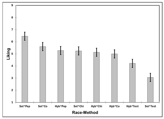 Average liking values of tostada consumers. Hyb*Co = Hybrid dehydrated Cónico corn tostada; Hyb*Chi = Hybrid dehydrated Chiquito corn tostada; Hyb*Pep = Hybrid dehydrated Pepitilla corn tostada; Hyb*Test = Hybrid dehydrated commercial corn tostada; Sol*Co = Solar-dehydrated Cónico corn tostada; Sol*Chi = Solar-dehydrated Chiquito corn tostada; Sol*Pep = Solar-dehydrated Pepitilla corn tostada; Sol*Test = Solar-dehydrated commercial corn tostada.