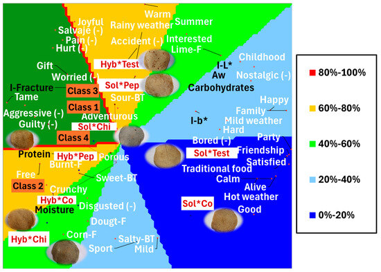 From a cognitive perspective, the tostada images evoked both positive emotions (tame, adventurous, free) and negative ones (disgusted, worried, aggressive, and guilty). However, the Hyb*Test (hybrid control) and Sol*Pep (solar Pepitilla) tostada samples were preferred (preference contour from 40 to 80% green and orange colors) by class 3 (9 consumers) because they were perceived as sour and lime-flavored, although the tostadas images evoked more negative emotions and memories (worried, accident, hurt, pain, wild) compared to positive emotions and memories (joyful, warm, rainy weather, summer, and interest). The Sol*Co and Sol*Test tostadas were in the lowest preference contours (0–20% blue), possibly because they evoked negative emotions (nostalgic and bored) and because they had physical characteristics such as high hardness and a yellow to blue color tone.