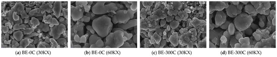 Comparing the surface morphology of the LiFePO4 electrode before and after the basic electrolyte cycle (Figure 8a–d), the surface of the LiFePO4 electrode before the cycle was relatively flat and smooth, without large-area adhesion, cracks or grooves. After 300 cycles, a relatively smooth CEI film was formed on the surface of the LiFePO4 electrode with a small amount of sediment. Further magnification observation showed that some particles of the LiFePO4 electrode have cracks on the surface, which hinder the migration of lithium ions, increases the interface resistance, and causes battery capacity decay.