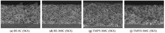 The cross-sectional view of the LiFePO4 electrode after 300 cycles with the addition of 5% TMP5 also showed partial collapse, but the cross-sectional view of the active material particles was smoother than that in Figure 9f, with slight cracks, which can slow down the attenuation of the battery capacity.