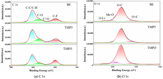Compared with the XPS analysis of the LiFePO4 electrode before cycling, the intensities of P and F were both reduced after cycling, as shown in Figure 10 and Figure 11. This demonstrated that after 300 cycles, the contents of P and F were both reduced. In the C 1s spectrum, the carbon elements on the surface of the LiFePO4 electrode existed in the form of C-C, C-O, C=O, C-F, etc., indicating that the organic compound ROCO2Li and the inorganic carbonate Li2CO3 existed in the CEI on the electrode surface [23,24], and C-F may come from polyvinylidene fluoride (PVDF). Compared with the basic electrolyte, after adding TMP5, the content of carbon elements on the surface of the LiFePO4 electrode, such as C-C, C-O, C=O, and C-F, basically did not change, while the C-O on the surface of the LiFePO4 electrode after adding TMPi5 decreased, and C-F increased, indicating that after 300 cycles, the CEI film on the surface of the LiFePO4 electrode with TMPi5 added was unstable, and PVDF was exposed on the electrode surface, resulting in an increase in the C-F content. In the O 1s spectrum, BE and TMPi5 had O-Li, and the methoxy (R-O-Li) content of TMPi5 was higher, while TMP5 did not have R-O-Li, indicating that TMP may inhibit the decomposition of BE to form R-O-Li. In the P 2p and F 1s spectra, phosphorus and fluorine may exist in the form of LixPOyFz, among which the phosphorus (P) and fluorine (F) content on the surface of the LiFePO4 electrode with TMP5 added was higher, which improves the electrochemical integrity of cells [25,26].