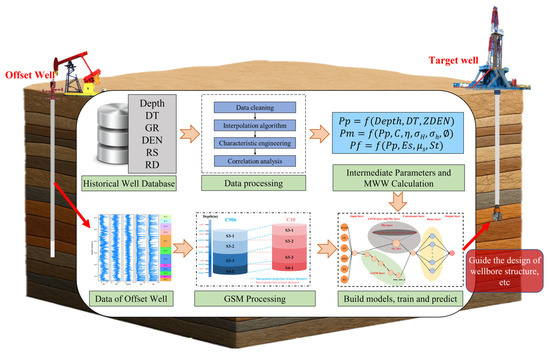 The mud weight window (MWW) directly determines wellbore stability, well control safety, and wellbore integrity [1,2] serving as the core foundation for drilling fluid density design, casing program optimization, and well control contingency planning. Inaccurate estimation can readily trigger high-risk events such as lost circulation, kicks, or even blowouts [3] resulting in substantial economic losses and environmental disasters. Therefore, accurate MWW prediction is not only a prerequisite for safe drilling and completion operations in complex formations but also a critical guarantee for enhancing the success rate of oil and gas resource development [4].