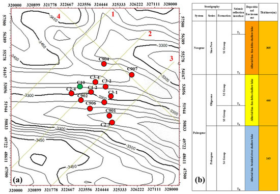 The case study data originates from Block C of a northwestern China oilfield. This block contains 12 wells, with well C10 serving as the target well. The well locations and fault distribution are shown in Figure 2a, while the comprehensive stratigraphic column is presented in Figure 2b [22]. This block belongs to a nose-shaped structure containing four faults of varying scales. Faults 1, 2, and 3 exhibit similar strike orientations with poor sealing capacity. The area has developed four oil-bearing formations—S1, S2, S3, and S4—with the S2 formation serving as the main productive reservoir. The S1 oil group consists of calcareous mudstone and oil shale in the middle section, gray mudstone and siltstone in the upper section, and brown-yellow sandstone and gray siltstone interbedded with calcareous mudstone in the lower section. The upper part of the S2 oil group develops gray-green and gray sandstone interbedded with calcareous sandstone and conglomeratic sandstone, while the lower part is dominated by brown-yellow sandstone and mudstone interbedded with gray and dark gray carbonate rocks. The lower section of the S3 oil group primarily develops dark organic-rich dolomitic limestone, with the upper section featuring superimposed gray dolomite and argillaceous dolomitic limestone interbedded with multiple salt rock layers. The S4 oil group is predominantly composed of brown-red and brown mudstone, sandy mudstone, and fine sandstone, with secondary gray and gray-yellow siltstone, argillaceous siltstone, and conglomeratic sandstone and conglomerate developed at the bottom. Through detailed subdivision, the S1 formation can be divided into four sublayers (S1-1, S1-2, S1-3, S1-4), the S2 formation into three sublayers (S2-1, S2-2, S2-3), the S3 formation into three sublayers (S3-1, S3-2, S3-3), and the S4 formation into two sublayers (S4-1, S4-2).