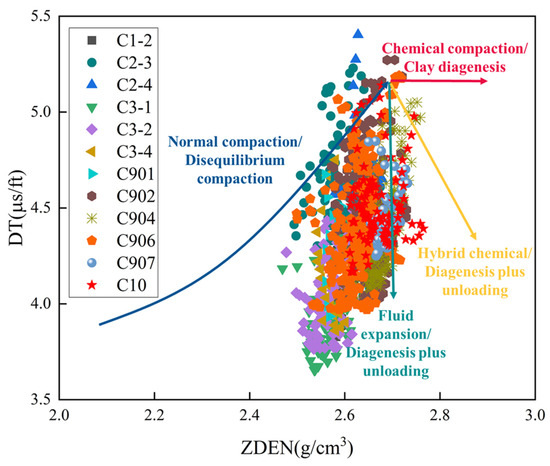 In this study, we constructed a sonic velocity–density crossplot for the target formations of 12 wells in Block C, as shown in Figure 3. Well C10 (denoted by the red pentagram in the legend) was plotted as the target well, revealing that the sonic velocity–density crossplot trends of offset wells are consistent with those of well C10. This demonstrates the feasibility of using offset wells’ sonic velocity–density crossplot to determine the over-pressure generation mechanism of the target well.