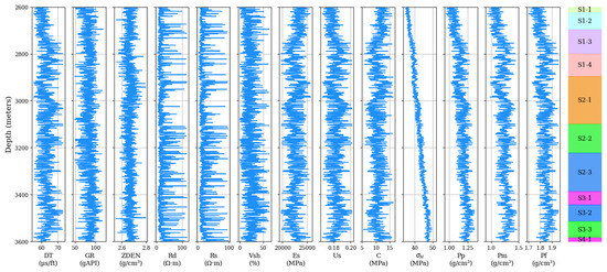 In this study, we collected six logging parameters from twelve wells (depth, sonic transit time (DT, μs/ft), deep-investigated double lateral resistivity log (Rd, Ω·m), shallow-investigated double lateral resistivity log (Rs, Ω·m), natural gamma ray (GR, gAPI), and bulk density (ZDEN, g/cm3)), along with fifteen theoretically calculated parameters, which were shale content (Vsh, %), P-wave velocity (Vp, m/s), dynamic elastic modulus (Ed, MPa), static elastic modulus (Es, MPa), dynamic Poisson’s ratio (Ud, dimensionless), static Poisson’s ratio (Us, dimensionless), uniaxial compressive strength (Sc, MPa), tensile strength (St, MPa), cohesion (C, MPa), internal friction angle (J, °), minimum principal stress (σh, MPa), maximum principal stress (σH,, MPa), pore pressure (Pp, g/cm3), collapse pressure (Pm, g/cm3), and fracture pressure (Pf, g/cm3), totaling 1,143,460 data points.