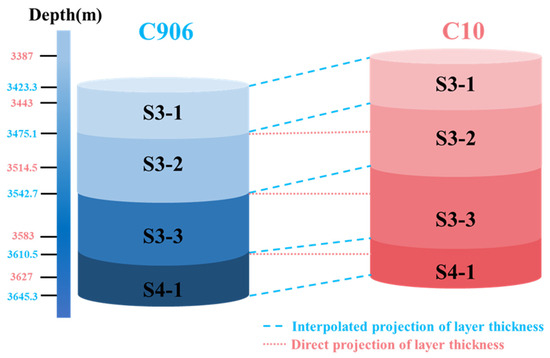 The geological sequence-matching method assumes that identical formations in offset wells within the same block possess uniform overall properties and vary uniformly within each layer, with the formation boundaries of the target well having been delineated through seismic data and historical drilling data during preliminary seismic exploration. This study utilizes well C906 to distribute post-drilling sonic logging data to each formation of well C10 through the geological sequence-matching method, as illustrated in Figure 5. For example, well C906 contains 1310 data points in the S3-1 formation (formation thickness: 51.8 m), and these 1310 data points are uniformly interpolated and distributed to the S3-1 formation of well C10 (formation thickness: 56 m). The depth calculation formula for the data point in the formation of the target well is shown in Equation (18) [29].
