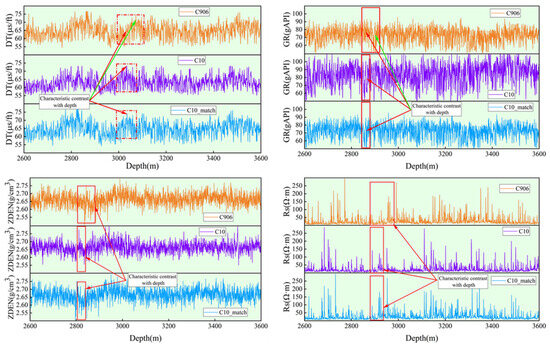 The data from well C906 processed using the geological sequence-matching method is designated well C10_match. The variation of selected parameters with depth for wells C906, C10, and C10_match is presented in Figure 6. It is evident that the C10_match well data processed through the geological sequence-matching method exhibits fundamentally identical trends to well C10, with consistent variations in detailed characteristics, although certain differences in data values persist. Compared to the conventional depth-based alignment method for processing C906 well data, the geological sequence-matching method, while unable to achieve complete consistency between offset well data and target well data, enables the predicted data trends to more closely approximate actual conditions.