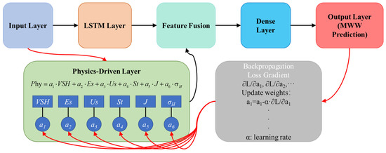 Traditional physics-based methods calculate rock mechanical parameters progressively through rock mechanics theory and empirical formulas; however, the dimensionless coefficients involved exhibit significant regional and depth-dependent characteristics, limiting prediction accuracy. While deep learning algorithms can establish complex nonlinear mapping relationships, they lack physical constraints and interpretability. Building upon the integration of traditional rock mechanics theory and deep learning techniques, this study proposes a physics-driven long short-term memory neural network (PD-LSTM) prediction method to enhance both the accuracy and interpretability of mud weight window predictions. Traditional physical models calculate various rock mechanical parameters through rock mechanics formulas, but the dimensionless coefficients and weighting factors involved often depend on regional and burial depth geological conditions, exhibiting significant non-uniqueness and regional adaptability limitations that make it difficult to comprehensively adapt to complex and variable wellsite environments. Although deep learning models possess powerful nonlinear mapping capabilities and can automatically learn complex high-order relationships between features, their “black box” characteristics result in a lack of necessary physical interpretation and domain credibility [33,34]. As shown in Figure 8, this study designs a physics-guided deep neural network architecture that embeds rock mechanics physical prior knowledge into the model, guiding deep learning to learn optimal mapping relationships within the space conforming to geological physical laws, thereby enhancing model performance stability and generalizability.