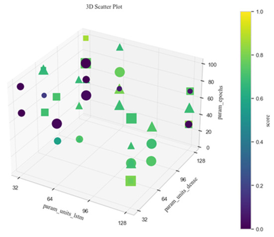 Part hyperparameters of the LSTM. (In this visualization, units_lstm, units_dense, and epochs are represented by the three axes of the graph, activation functions are denoted by symbol shapes (triangles represent specific activation types), batch size is indicated by marker size, and model performance scores are reflected through color variations).