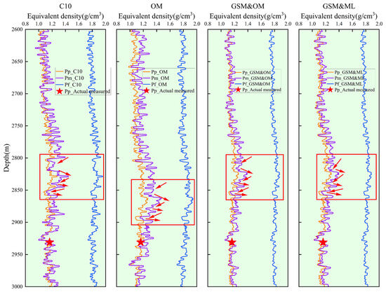 The mud weight window prediction results from the three methods and the post-drilling regression results of well C10 are presented in Figure 10. It can be clearly observed that the predicted results from all three methods are generally consistent with the numerical magnitude and trends of well C10. The red box in the figure highlights a section where distinct trend variations can be observed. Taking pore pressure as an example, within this wellbore interval, Pp initially exhibits a slight decreasing trend, followed by relative stability, then a slight increasing trend, which is immediately followed by a decreasing trend, an increasing trend, another decreasing trend, and subsequently a rapid increasing trend. However, the depth window where the Pp_Original method (Pp_OM, the following text uses abbreviations) exhibits this trend pattern occurs from 2840 m to 2900 m, while the trend windows for both the Pp_ GSM&Original method (Pp_GSM&OM, the following text uses abbreviations) and Pp_GSM&Machine learning (Pp_GSM&ML, the following text uses abbreviations) range from 2799 m to 2860 m, which is consistent with the trend window found by the post-drilling regression analysis of well C10. It is noteworthy that this trend is consistent with the results observed in DT, ZDEN, GR, and Rs presented in Figure 6. The underlying reason for this is that the original method neglects inter-well geological variations when predicting mud weight windows. After GSM processing, the geological conditions of the target well can be estimated with maximum precision in situations where subsurface data cannot be directly obtained. This depth alignment capability, through accurate capture of local dynamic variation characteristics of mud weight windows in complex formations, enables meter-scale refined customization of mud weight window schemes under complex formation conditions, thereby providing more robust technical support for pre-drilling engineering design.