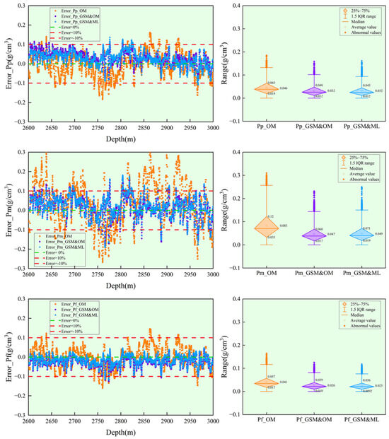 Figure 11 presents the box plots of error and absolute error distributions for Pp, Pm, and Pf predicted by the three methods. From the perspective of error distribution trends, the methods utilizing GSM processing as geological parameters demonstrate that the errors of Pp, Pm, and Pf are all distributed within ±10%. Regarding collapse pressure errors, the absolute error mean of Pm_OM is 0.083 g/cm3, while the error means of Pm_GSM&OM and Pm_GSM&ML are as low as 0.047 and 0.049 g/cm3, respectively. The error means of Pm_GSM&OM and Pm_GSM&ML represent a decrease of 43.37% and 40.96% compared to the original method, respectively, demonstrating the effectiveness of the proposed approach in this study. Regarding pore pressure errors, the error mean of Pp_OM is 0.046 g/cm3, while the error means of both Pp_GSM&OM and Pp_GSM&ML are as low as 0.032 g/cm3. The error means of Pp_GSM&OM and Pp_GSM&ML show a decrease of 30.43% compared to the original method. In terms of fracture pressure errors, the error mean of Pf_OM is 0.041 g/cm3, while the error means of Pf_GSM&OM and Pf_GSM&ML are as low as 0.026 and 0.025 g/cm3, respectively. The error means of Pf_GSM&OM and Pf_GSM&ML are decreased by 36.59% and 39.02% compared to the original method, respectively. These results demonstrate the effectiveness of the approach proposed in this study.