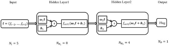 In this study, the BP neural network designed comprises two hidden layers, and . The number of neurons in each hidden layer is set as and respectively. For the hidden layers and , we select the ReLU (Rectified Linear Unit) activation function . This function serves to enhance the feature impact during the iterative process. In the output layer, the sigmoid function is used, which maps the output value to .