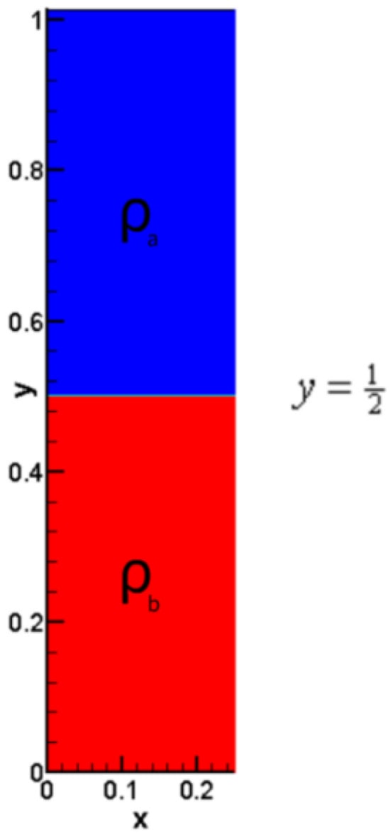 where is local sound speed, is the amplitude coefficient of perturbation. The initial conditions satisfy hydrostatic equation . The left and right boundary conditions are reflective boundary conditions, while the top and bottom boundary condition are and , respectively. As shown in Figure 2, two layers of fluid with different densities are separated by .