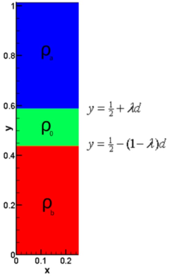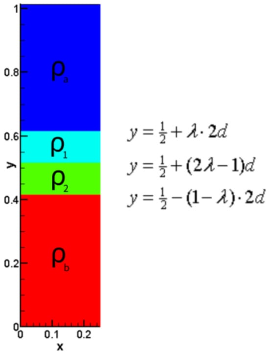 Case 3 can be constructed by adding two layers fluids between the two layers of Case 1. To eliminate the effect of width, the two added layers are set to have the identical width. Set the width of each layer as d, the density of the added light fluid as , the density of the added heavy fluid as . And let the top boundary of two added layers of fluid be , the bottom boundary be . Hence, the interface between the two added layers lies at as shown in Figure 4.