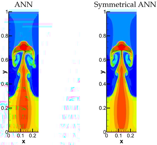 High order WENO scheme is one of popularly used numerical methods for simulating RTI and can generate reliable numerical results. However, it is too dissipation for resolving the fine scale structures, such as Kelvin–Helmholtz instability (KHI) [4] along the interface. Furthermore, when it comes to a specific order and resolution, the WENO scheme presents greater implementation complexity and demands more computational resources in comparison to linear finite difference schemes. Therefore, we conduct the numerical studies by high order hybrid scheme for simulating RTI phenomena and show the corresponding results in the left of Figure 5. One can easily find that the numerical result is asymmetrical at the top of structure of mushroom, which is inconsistent with the initial symmetrical setup. It is because the ANN shock detector does not maintain the symmetry. In order to overcome this shortcoming of ANN shock detector, we detect the shock locations starting from the symmetry axis to both sides, respectively. The correspondingly modified result with symmetrical ANN shock detector is shown in the right of Figure 5. It is obvious to find that the symmetry of RTI is maintained.