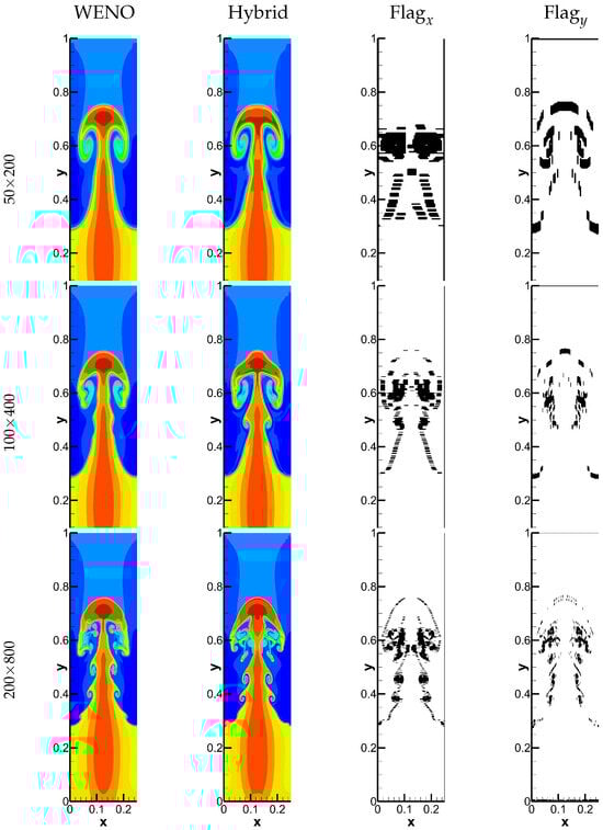 In this section, the high order hybrid compact–WENO scheme is used to simulate the three cases in Section 3. The grid resolution is and the final time is .