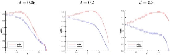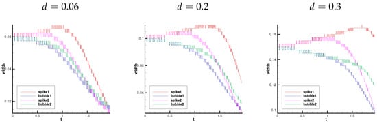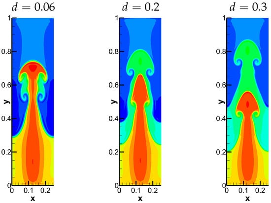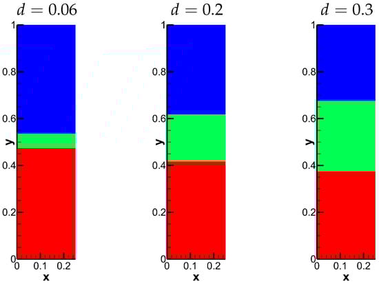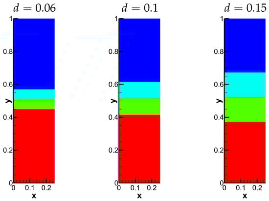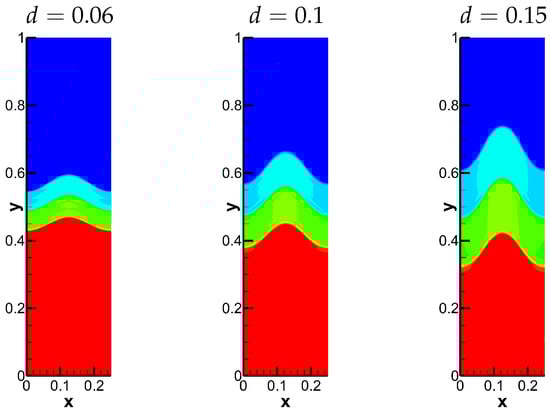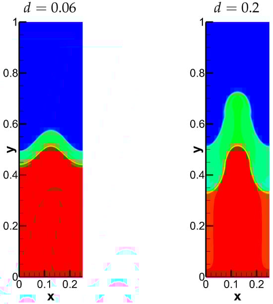 Spike and bubble are two important structures in the RTI phenomenon. Spike is the structure developed by a heavy fluid in a light fluid, while bubble is the structure developed by a light fluid in a heavy fluid. In order to clearly observe the development process of spike–bubble of two RTI phenomena, the temporal evolution of spike–bubble gap is drawn in Figure 9. From figure, one can find that the changing process of the gap widths between two interfaces can be divided into three stages roughly. In the first stage, the gap widths at the location of both spike and bubble remain the initial conditions for a short time. In the second stage, the gap width at the location of spike increases slowly, while the gap width at the location of bubble decreases slowly. In the third stage, the gap width at the location of spike begins to decrease rapidly, and the gap width at the location of bubble continues decreasing even faster. In the case of , the second and third stages are continuous, the gap width at the location of spike begins to decrease around and for and , respectively. When the initial gap width is larger , there is a stable period between the second stage and the third stage, during which the gap widths at the location of both spike and bubble remain unchanged. The gap widths at the location of both spike and bubble remain unchanged during . For initial gap width d is small and , the densities at the moment from the second stage to the third stage are shown in Figure 10. It can be observed that the height of the interfaces between two heavier layers at the location of spike is the same as that between two lighter layers at the location of bubble.