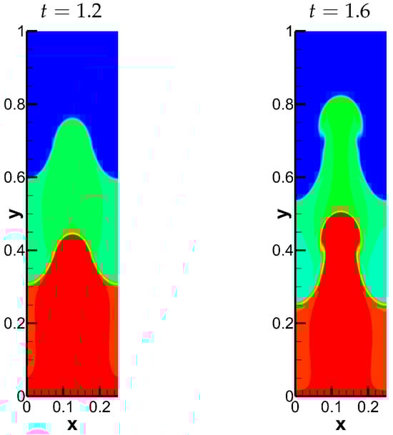 In Case 2, the coupling strength between interfacial Rayleigh–Taylor instabilities (RTI) is governed by the middle layer width d, exhibiting three distinct regimes: (1) for narrow widths, adjacent interfaces merge rapidly, reproducing single-interface (Case 1) behavior; (2) intermediate widths enable sustained multi-layer interactions with characteristic nonlinear coupling; and (3) wide spacings permit nearly independent interface evolution. In this work, we take for example and plot the initial conditions in Figure 7. The corresponding numerical results computed by the hybrid scheme are shown in Figure 8.