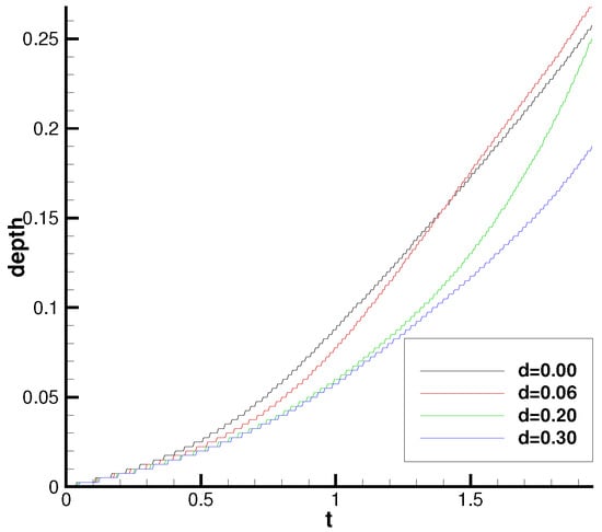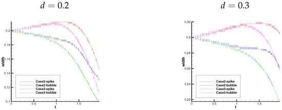 Another phenomenon can be observed in Figure 8, the penetration depth of the spike on the higher density side is related to the width of the middle layer. As shown in Figure 8, the evolution of spike is similar to Case 1 when the width of the middle layer d is small, while it penetrates shallower as d gets larger. The penetration depth–time image of the spike on the high density side is shown in Figure 12.
