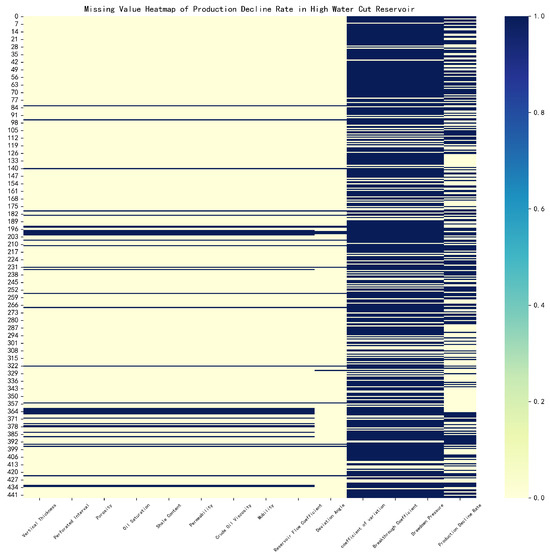 Heatmap of missing values in the sample dataset for production decline rates of high water-cut offshore oil reservoirs.