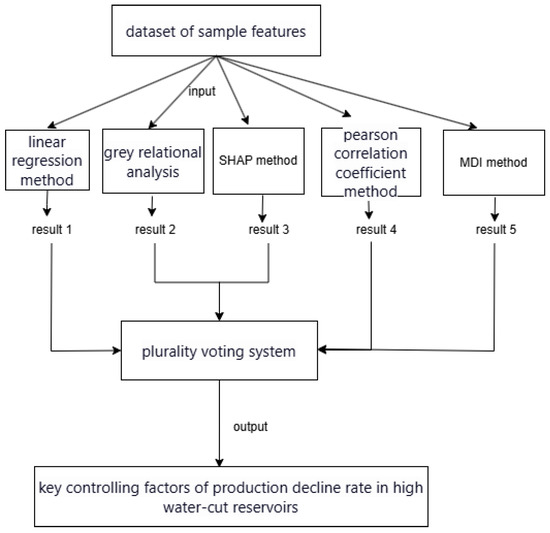 Feature engineering was performed on the cleaned sample dataset of production decline rate in offshore high water-cut reservoirs. Given the limitations of individual feature engineering methods, such as strong reliance on linear assumptions, sensitivity to noise and small samples, and a lack of dynamic robustness verification [36], this paper adopts a comprehensive feature engineering approach that integrates five methods: linear regression, Grey Relational Analysis (GRA), Shapley Additive Explanations (SHAP), Pearson correlation coefficient, and Mean Decrease Impurity (MDI). The workflow of this integrated approach is illustrated in Figure 3. The main steps of this method are as follows: First, the sample dataset of production decline rate in offshore high water-cut reservoirs is input into linear regression, GRA, SHAP, Pearson correlation coefficient, and MDI to perform their respective calculations and obtain the corresponding results. Second, the top 70% of features are selected based on the feature engineering evaluation criteria of each method. Then, a majority voting approach is applied, where features identified by three or more methods are considered the finally selected key influencing factors. Finally, the selected key influencing factors are output as the dominant factors for the production decline rate in the offshore high water-cut reservoir sample dataset.