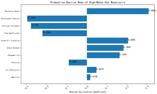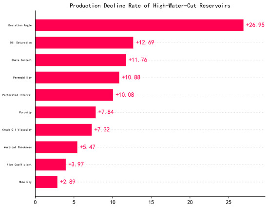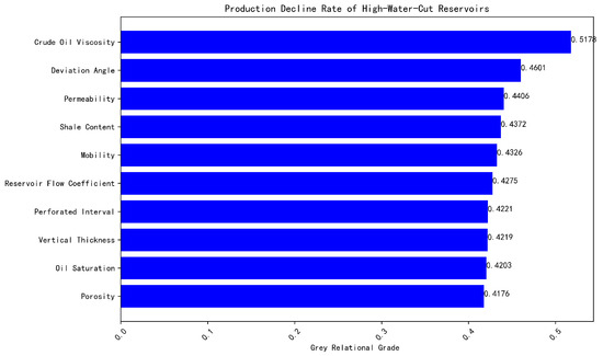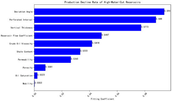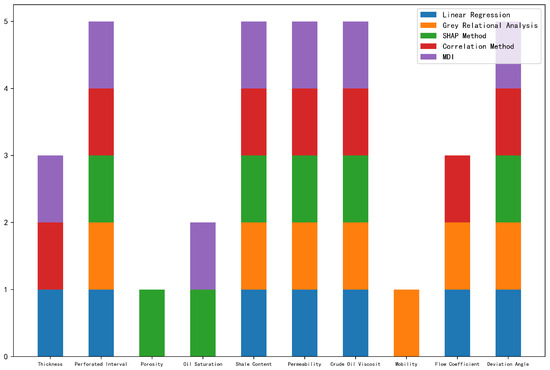 The results of linear regression, GRA, SHAP, Pearson correlation coefficient, and MDI are shown in Figure 4, Figure 5, Figure 6, Figure 7, and Figure 8, respectively. In linear regression, GRA, SHAP, Pearson correlation coefficient, and MDI, a larger fitting coefficient with the production decline rate, a higher grey relational grade, a larger SHAP value, a larger absolute value of the Pearson correlation coefficient, and a higher importance score, respectively, indicate that the feature is more likely to be a key influencing factor. The key influencing factors identified by each method are then subjected to majority voting, and the results are shown in Figure 9. As shown in Figure 9, the key influencing factors for the production decline rate in the offshore high water-cut reservoir sample dataset are vertical thickness, perforated thickness, shale content, permeability, crude oil viscosity, formation flow coefficient, and well deviation angle.
