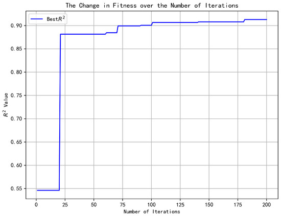 The MFO algorithm was employed to optimize the hyperparameters of the XGBoost model using the training set. The fitness function was set as the average coefficient of determination (R2) obtained from 10-fold cross-validation of the XGBoost model in each iteration. The population size was set to 50 with 200 iterations. The six hyperparameters optimized were: n_estimators (number of trees), learning_rate (step size for weight updates in each iteration), max_depth (the greatest depth of a tree), gamma (the minimum reduction in the loss function needed to justify an additional split on a leaf node), subsample (the proportion of samples to be randomly selected for each tree), and colsample_bytree (the proportion of features to be randomly selected for each tree). After 200 iterations, the coefficient of determination (R2) of the MFO-XGBoost method on the testing dataset reached a maximum value of 0.9128 and converged at the 180th iteration. The iterative optimization process of the optimal hyperparameters for MFO-XGBoost is shown in Figure 10, and the optimal hyperparameter values for the MFO-XGBoost method are listed in Table 3.