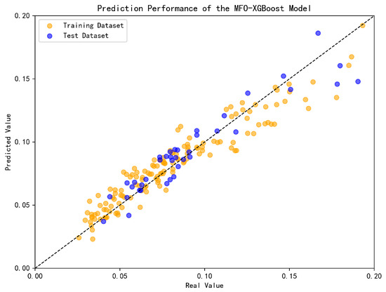 (5) Model Training and Prediction: Assign the optimal hyperparameters obtained to the XGBoost model and retrain it. Apply the trained XGBoost model to the testing set to obtain the final prediction results of the MFO-XGBoost method.