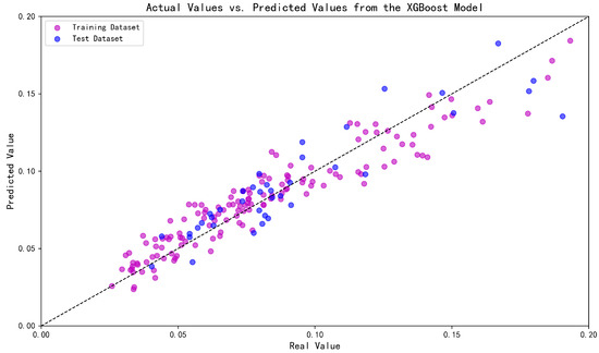 The MFO-XGBoost method, built using the optimal hyperparameter combination, was used to predict the production decline rate in offshore high water-cut reservoirs. The calculated results from the exponential decline model were taken as the true values of the production decline rate. The results are shown in Figure 11. The results indicate that the MFO-XGBoost method achieved a coefficient of determination (R2) of 0.9542 on the training set and 0.9128 on the testing set. This demonstrates that the MFO-XGBoost method exhibits a good predictive performance for the production decline rate in offshore high water-cut reservoirs.