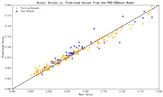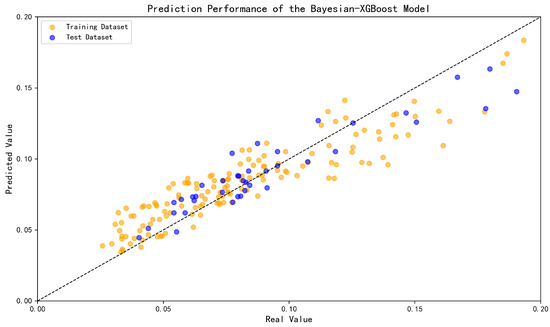 As shown in Figure 15 and Table 5, compared to the MFO-XGBoost method, the Bayesian-XGBoost model showed average prediction performance. In the testing set, there were several wells where the predicted production decline rate differed significantly from the calculated results of the exponential decline model, leading to poorer overall prediction performance. As shown in Figure 16 and Table 5, the PSO-XGBoost model exhibited overfitting, with good prediction performance on the training set but a significant decline in prediction performance on the testing set. Thus, the MFO-XGBoost method demonstrated the best prediction performance for the task of predicting the production decline rate in offshore high water-cut reservoirs. The underlying mechanisms for the superior prediction performance of the MFO-XGBoost method are as follows: