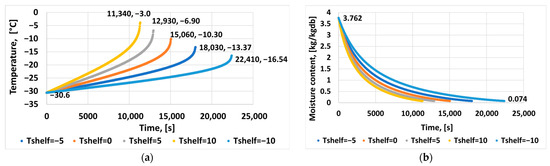 The freeze-drying process was simulated by solving the mathematical model presented in Section 2, using the initial parameters listed in Table 1. To enhance clarity, the key process parameters for the simulations are summarized in Table 2. Specifically, five different shelf temperature conditions (−10 °C, −5 °C, 0 °C, 5 °C, and 10 °C) were tested, while the condenser plate temperature (−32 °C) and chamber pressure (35 Pa) were kept constant throughout the experiments. These values were selected to evaluate the influence of shelf heating temperature on the primary drying performance. The variations in surface temperature and moisture content during drying are illustrated in Figure 3.
