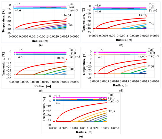 Comparison of the dry layer temperature of Cordyceps militaris with the glass transition temperature (Tg) and collapse temperature (Tc) under different shelf temperature conditions: (a) Tshelf = −10 °C; (b) Tshelf = −5 °C; (c) Tshelf = 0 °C; (d) Tshelf = 5 °C; and (e) Tshelf = 10 °C. The Tr(i) curves represent the temperature distribution across the sample radius at different time points.