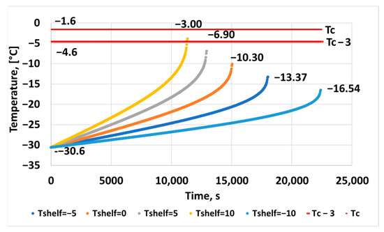 Under fixed condenser temperature and chamber pressure, the shelf temperature was varied from −10 °C to 10 °C. The results from the numerical model based on the coupled heat and mass transfer equations provided the temperature distribution and maximum temperature in the dry layer for five drying modes, as presented in Table 4 and Figure 4 and Figure 5. The results indicate that to ensure ΔT > 3 °C, the shelf temperature should not exceed 5 °C. Among the five investigated modes, the one with a shelf temperature of 10 °C presents a high risk of structural collapse and product shrinkage. At that point, the surface temperature of the drying material has exceeded the shrinkage avoidance condition.