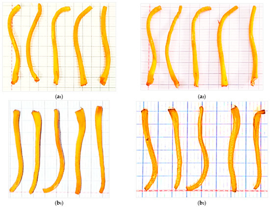 Images of fresh (a1,b1) and dried (a2,b2) Cordyceps militaris under two drying conditions: (a1,a2) correspond to Tshelf = −10 °C, Pchamb = 35 Pa, Tconde = −32 °C; and (b1,b2) correspond to Tshelf = 10 °C, Pchamb = 35 Pa, Tconde = −32 °C.