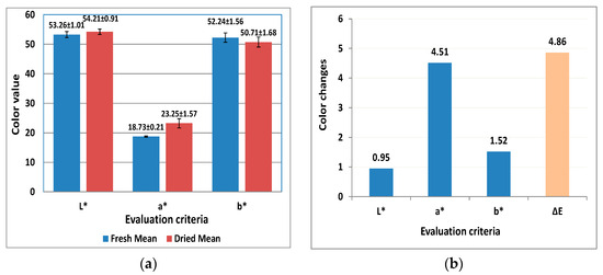 The color of fresh and dried Cordyceps militaris samples was analyzed using a KONICA MINOLTA CR-400 colorimeter. Color parameters (L*, a*, b*) of fresh and dried Cordyceps militaris samples are shown in Figure 8. The average L*, a*, and b* values of fresh samples were 53.26 ± 0.01, 17.91 ± 0.21, and 50.76 ± 1.56, respectively. After freeze-drying, these values changed to 54.21 ± 0.91, 23.25 ± 1.57, and 50.71 ± 1.68, respectively. Statistical variability is shown as standard deviation (SD), with n = 3 for fresh and n = 9 for dried samples. Based on these values, the color difference was calculated using Equation (7) [29,30,31], ΔE = 4.86.