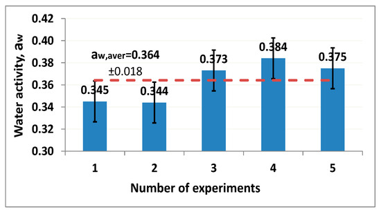 The water activity values of the dried samples obtained from five independent experiments ranged from 0.344 to 0.384, with an average of 0.364 ± 0.018 (n = 5) (shown in Figure 9). This value is quite similar to the water activity of dried Cordyceps militaris reported by Xiao-Fei Wu et al. [6], which ranged from 0.35 to 0.36. With a water activity of 0.364, food safety is ensured. At this level, the growth of bacteria, molds, and pathogenic microorganisms is inhibited, along with the reduction of risks such as oxidation, loss of micronutrients (e.g., vitamins C, A, and B1), and color degradation, thereby extending the product’s shelf life. Therefore, the dried product meets the criteria for good quality and long-term storage [2,42,43].