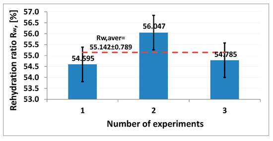 The rehydration ratio Rw measured from three independent experiments ranged from 54.595% to 56.047%, with an average value of Rw = 55.142 ± 0.789% (n = 3). Figure 10 illustrates the variation in rehydration capacity, with error bars representing the standard deviation of the dataset. These results demonstrate that the dried samples exhibited good rehydration capacity, with an average recovery rate of 55.14% relative to the amount of water lost during drying. This value is slightly higher than the 54% reported by Xiao-Fei Wu [6]. Moreover, the rehydration process occurred rapidly, with most water uptake completed within approximately 150 s, underscoring one of the key advantages of the freeze-drying method.