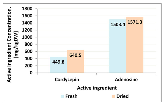 The HPLC extraction results indicated that the Cordyceps militaris sample exhibited a high adenosine content, while the cordycepin content was lower than some previously published results [1,2,5]. This discrepancy may be attributed to differences in substrate composition and cultivation methods. Notably, the adenosine and cordycepin contents extracted from the dried Cordyceps militaris sample were higher than those from the fresh sample (shown in Figure 11). Specifically, the adenosine content in the dried and fresh Cordyceps militaris samples was 1571.3 and 1503.4 mg/kg, respectively, while the cordycepin content in the dried and fresh samples was 640.5 and 449.8 mg/kg, respectively. These findings suggest that the freeze-drying method, along with this specific drying mode, does not diminish the active ingredients adenosine and cordycepin but rather enhances their extraction efficiency. Similar results were reported by Nguyen Thien Thao and colleagues [33]. In contrast, Zhu S.J. et al. [44] found that the levels of adenosine and cordycepin were comparable between dried and fresh samples. This discrepancy could be due to variations in the origin of the biological materials, differences in the freeze-drying parameters, or the specific techniques employed during processing.