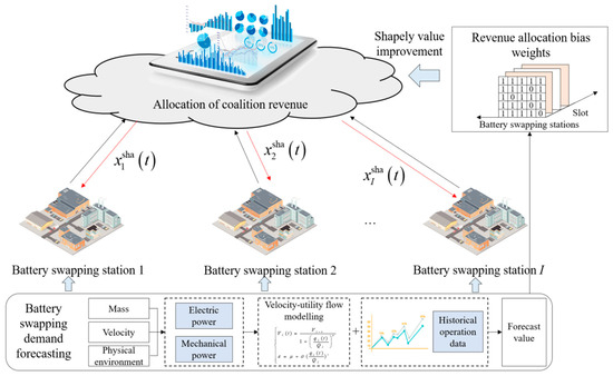 where is the average return of all BSSs. is the desired impact factor, , and the higher baseline forecast value for the BSS in the current period indicates that the BSS is experiencing a peak battery-swapping demand, which results in a higher expected influence factor. Likewise, BSSs with higher revenue receive a greater revenue-allocation bias weight, granting them a larger share of the revenue allocation within the coalition.