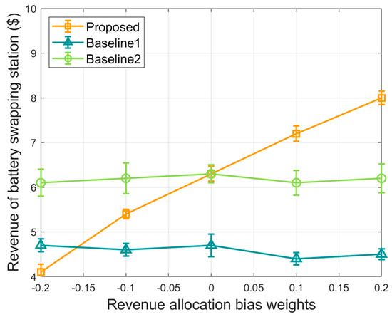 Figure 3 illustrates the relationship between the revenue of the BSS and the bias weight coefficient used for revenue allocation. Simulation results show that the revenue of the proposed algorithm increases significantly with the value of the revenue-allocation bias weight coefficient. Compared to Baseline 1 and Baseline 2, the revenue from the proposed algorithm is 35.91% and 28.54% higher, respectively. This improvement is mainly attributable to the adaptive Shapley value approach used in the proposed algorithm. Unlike traditional Shapley value methods that focus solely on marginal contributions, our approach introduces a bias weight coefficient for revenue allocation to evaluate the contribution and importance of each BSS within the coalition, leading to a more equitable and realistic revenue distribution. This not only encourages active participation but also enhances operational efficiency. In comparison, Baseline 1 lacks cooperation among BSSs, ignoring their synergistic resource sharing and coordinated scheduling, which results in inefficient resource allocation and higher revenue variance. Baseline 2, despite considering stochastic optimization, fails to account for individual contributions, leading to the generation of inflexible revenue-allocation bias weights. This causes suboptimal battery scheduling and load balancing, reducing overall efficiency and revenue. The proposed algorithm addresses these limitations by integrating both marginal contributions and individual characteristics, achieving superior performance in revenue enhancement and operational efficiency.