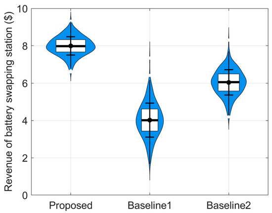 Figure 4 shows a box plot of the BSS revenue under different algorithms. The simulation results show that the revenue variance generated by the proposed algorithm is 68.29% and 12.09% lower, respectively, compared with Baseline 1 and Baseline 2. This is because the proposed algorithm constructs a demand-forecasting model for battery swapping that accurately simulates the battery-swapping behavior of electric heavy-duty trucks. This improves the accuracy of BSS demand forecasting, enabling more precise charging-strategy scheduling and power adjustment to meet actual needs, thus reducing resource wastage. Baseline 1 involves only competition, with no cooperation, and achieves low average revenue and the largest revenue variance.