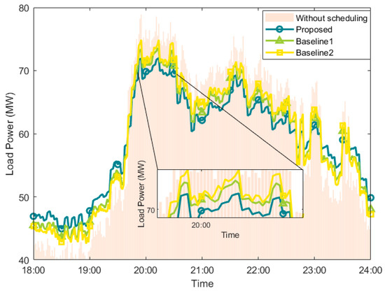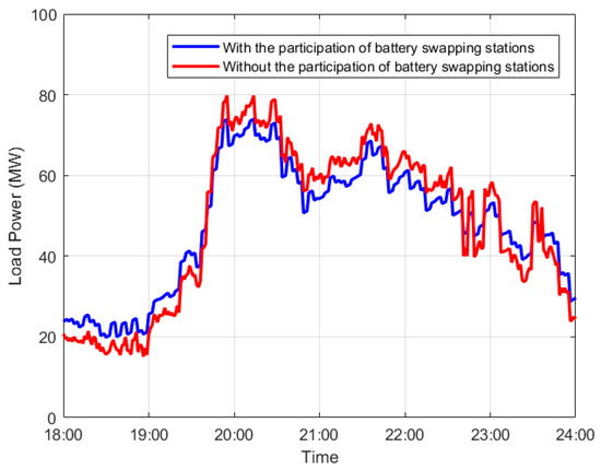 Figure 5 illustrates the variation in load power across the distribution network versus time, considering the participation of BSSs in the demand response. The simulation results show that the variation in load power between 18:00 and 24:00 was reduced by 23.41% after the battery-swapping scheduling was applied according to the proposed algorithm. This is because the proposed algorithm can provide more accurate demand forecasting for BSSs to optimize the scheduling of the charging strategy. The adjustment of the charging power is allowed to adapt to the actual demand, effectively reducing the ineffective consumption of resources. To balance the load on the power grid and improve the stability and economy of the power system, power consumption is reduced during the time of peak power demand and power consumption is increased during the demand valley.