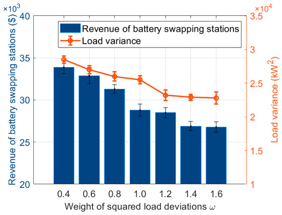 Figure 7 illustrates the variation in the revenue of the BSSs versus weights. When the weight increased from 0.4 to 1.6, the revenue of the BSS decreased by 18.18% and the load deviation decreased by 19.44%. This is because, with the increase in weight, the cooperation between the members of the coalition results in more attention being paid to the optimization of the load-deviation variance, rather than the revenue of the BSS. As a result, the BSS can enhance the priority of peak shaving and valley filling to reduce the variance in load power on the power grid.