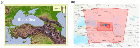 Physical map of the Caucasus region, showcasing the heterogeneous relief of Georgia and adjacent territories (a), and location of nested WRF-Chem model computational domains (b).