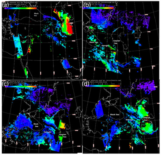 As can be seen from Figure 3a, the maximum AOD values were recorded in the western and southern parts of the Caspian Sea and adjacent land areas, which, in the western direction, reached the territory of eastern Georgia (where the AOD values varied from 0.4 to 0.6) at 06:45 on 30 May 2024. Figure 3b, which presents the AOD distribution 3 h later (at 09:45 on 30 May), shows that during this short period of time, the observed dust spots from the Caspian Sea mainly moved in the west–north direction over the territory of Russia but still covered the territories of Azerbaijan and eastern Georgia. Figure 3c shows that the area occupied by the dust cloud included the easternmost part of the Black Sea and the northern area bordering the territory of Georgia, but the territory of Georgia (except for the easternmost territory of Georgia) was free of dust spots. Figure 3d shows that the dust spot has again moved back into the Caspian Sea; however, in Georgia, residual concentrations of AOD were still only locally recorded in some regions at 10:25 on 31 May.