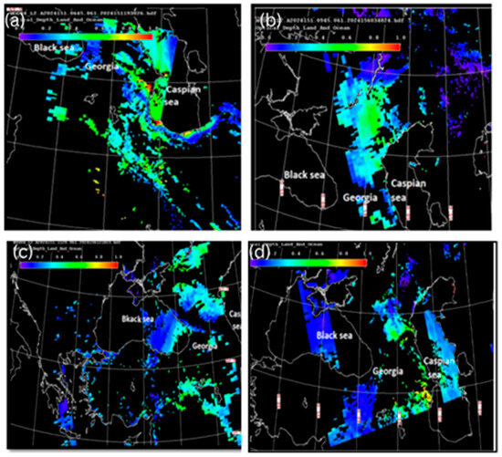 As mentioned above, to illustrate the main features (sources, routes and timing of long-range transport) of long-range airborne dust transport to the territory of Georgia in complex orographic conditions, two of the most typical cases (28–31 May 2024 and 24–30 April 2024) were selected from the 38 identified cases of long-range airborne dust penetration to the territory of Georgia. The maps of the altitude–orbit cross-section horizontal measurements of AOD obtained from MODIS version 3.40 at different times (UTC) show that the maximum AOD values were recorded over the Caspian Sea, on the eastern coast of the Mediterranean Sea, and weak AOD values were observed over the Main Caucasus Range at 10:55 a.m. on 27 May 2024 (Figure 2a). As can be seen from Figure 2b (presenting the AOD distribution pattern at 07:00 a.m. on 28 May 2024), the strong dust band left the Caspian Sea, was shifted from the Caspian Sea to the southwest and was distributed from the territory of Azerbaijan to the eastern part of Georgia. Figure 2c,d, presenting the AOD distribution pattern on 29 May 2024 at 07:40 and 10:40 a.m., respectively, show that the AOD values gradually increased and expanded throughout the Caspian Sea and almost reached the Black Sea in the westward direction (Figure 2d).
