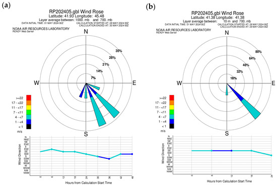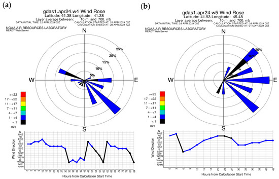 According to MODIS, on 25–28 April 2024, the maximum concentration of AOP was recorded in Western Georgia, and on 29–30 April, the maximum concentration was recorded in Eastern Georgia. Therefore, to study the main atmospheric flows for this period, Batumi in Western Georgia and Telavi in Eastern Georgia were selected and a wind rose of the READY system was constructed for these two regions (Figure 9). As can be seen from Figure 9a, the main wind direction for the Batumi region was southeast, although at the same time, a weak westerly and northwesterly wind was recorded on 25–28 April 2024. From Figure 9b, it is clear that on 29–30 April 2024, the main wind directions for Telavi were east, southeast and northeast.