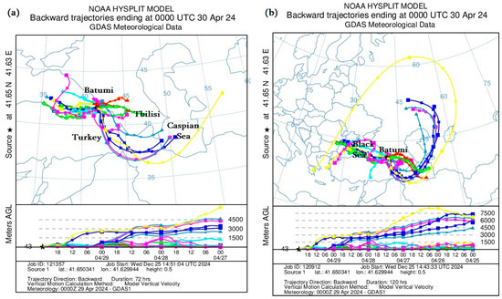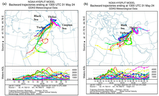 To better understand the dust storm tracks and their origins, both forward and backward HYSPLIT model trajectories were studied for Tbilisi, Rustavi, Batumi, Kutaisi, Telavi and the easternmost point of Georgia, Dedoplistskaro (41°27′ N, 46°6′ E), but in this paper, for simplicity, only the backward HYSPLIT model trajectories for Tbilisi, Rustavi and Telavi are plotted and analyzed. The HYSPLIT model calculations showed that the transfer of ADD had a rather different nature in different tropospheric layers of the atmosphere. For example, mineral dust was transferred to the territory of Tbilisi and Rustavi from the territories of Syria and Iraq (through the territory of Turkey) in relatively high layers of the atmosphere (1–4 km), and below 1 km, it was transferred from the Caspian Sea (through the territory of Azerbaijan) on 29–31 May 2024 (Figure 5). Also, atmospheric dust entered the territory of Western Georgia from both the Black Sea and the Aral Sea desert on 26–29 April 2024 (Figure 10a,c), and over a longer period of time, the trajectory of dust particles could have also had a strange cyclonic character on 24–29 April 2024 (Figure 10b,d), which indicates a rather complex nature of the ADD transfer paths in the conditions of the complex orography of the Caucasus (Figure 1a).