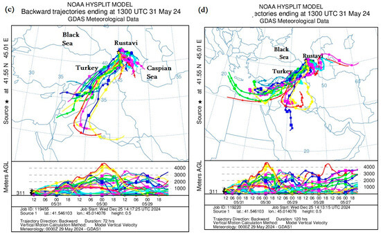 Distribution of mineral dust calculated by the Backward Ensemble trajectory of the HYSPLIT model at different atmospheric heights over the territory of Georgia ((a,c)—from 31 to 29 May 2024; (b,d)—from 31 to 27 May 2024).